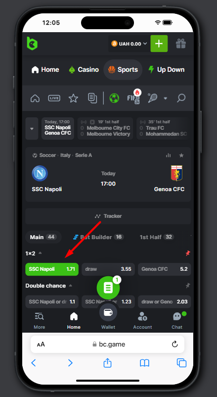 - Navigating to the sports betting category automatically redirects the gambler to the sports betting platform. The screen displays a list of sports events with their odds.