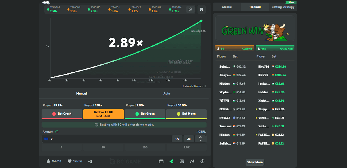 | Special Features | Trenball mode allows betting on predicted multiplier ranges (Red, Green, Moon) |