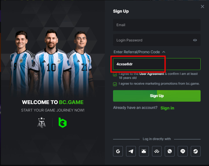 - Register at BC.Game. Sign up by navigating to BC.Game and using the referral link. The process is streamlined and ensures that the promotional code 4cxse6dr is automatically applied to your account.