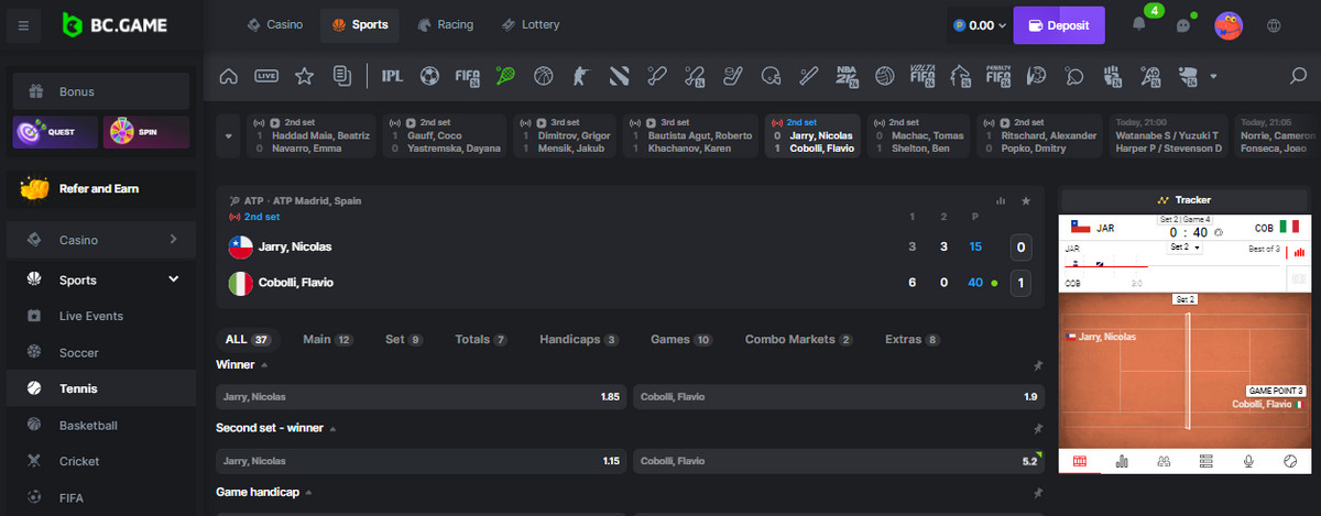- Locate the “Sports” pane for betting after logging in. Tennis on the site BC.Game is found under the pane “Sports.”