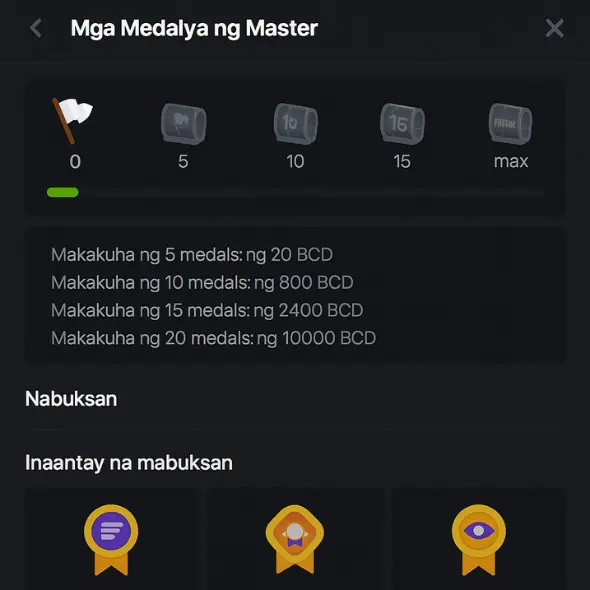 • Mga Detalye . Ang opisyal na site ng BC.Game ay nagsisilbing repositoryo ng mga detalyadong impormasyon tungkol sa pamantayan para sa pagkamit ng bawat medalya at ang mga partikular na gawaing kinakailangan.