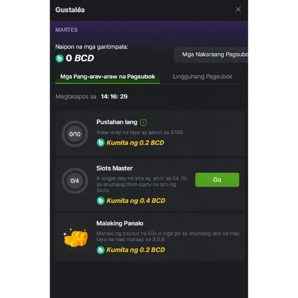 Tungkol sa mga gantimpala mula sa Pang-araw-araw at Lingguhang Quests, ang mga ito ay karaniwang na-kredito sa iyong account pagkatapos ng pagmamadali kapag natupad ang mga itinatakda sa paghahanap. Bagama’t karaniwan ang agarang pag-kredito, maaaring mangyari paminsan-minsan ang isang nominal na agwat sa pagproseso. Kung may pagkakaiba sa pagitan ng pagkumpleto ng iyong quest at pagtanggap ng reward, ipinapayong suriin muli ang pamantayan sa paghahanap. Kung magpapatuloy ang mga pagkakaiba, ang pakikipag-ugnayan sa suporta sa customer ng BC.Game ay inirerekomenda para sa karagdagang gabay.