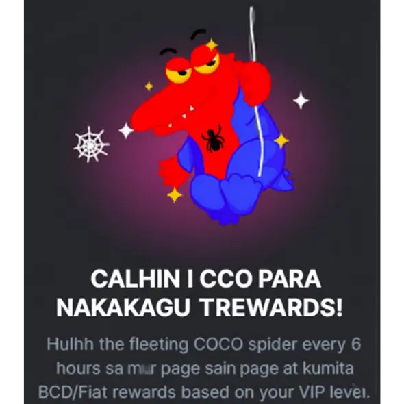 • Mekanismo . Ang spider mascot ng platform, ang COCO, ay gumagawa ng hindi inaasahang pagpapakita tuwing 6 na oras. Ang mga manlalaro ay inatasang maging alerto at maliksi na mag-click sa COCO sa paglitaw nito.